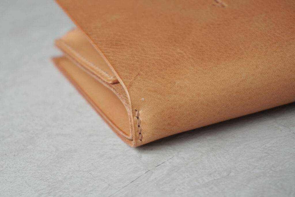 小さくてシンプルに見えるのですが、部分的に3枚重ねたコバや全体の形状、金具の使い方など、細かい工夫が詰まっております。