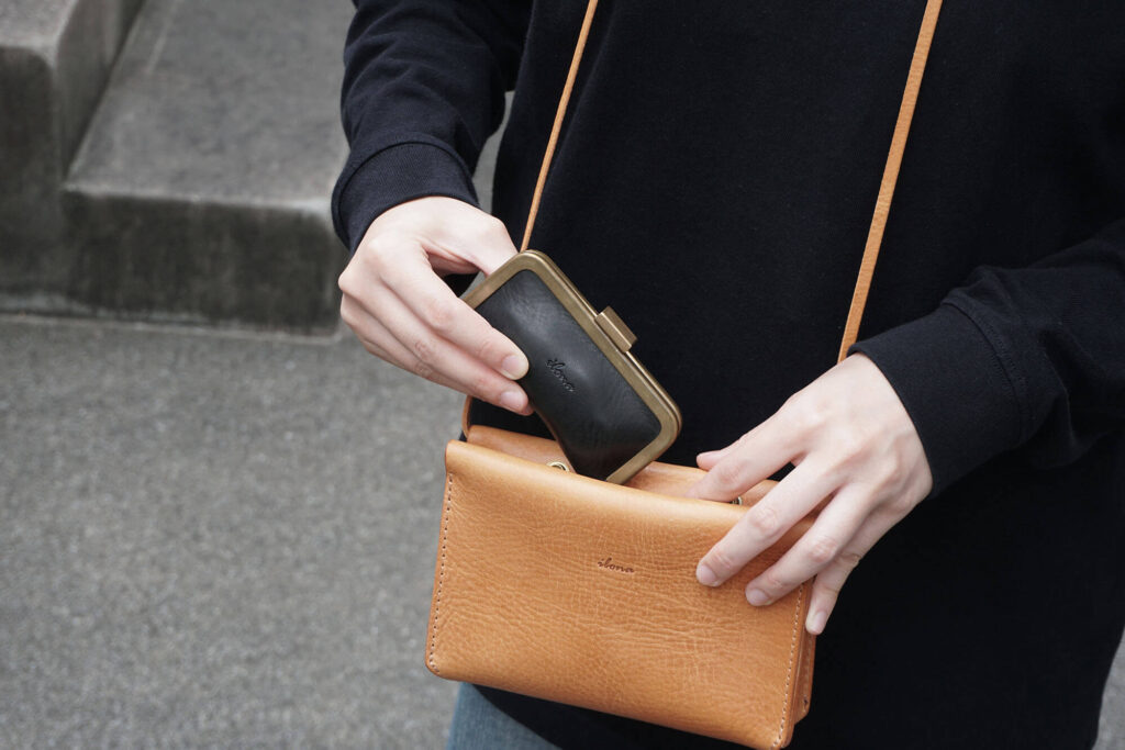 昔ながらの可愛らしいがま口、というよりは、小さいけれどかっこよく存在感のあるヌックさん。
