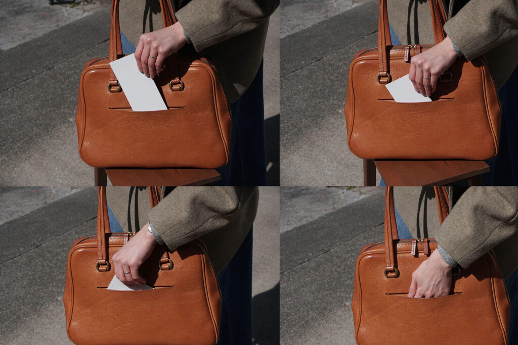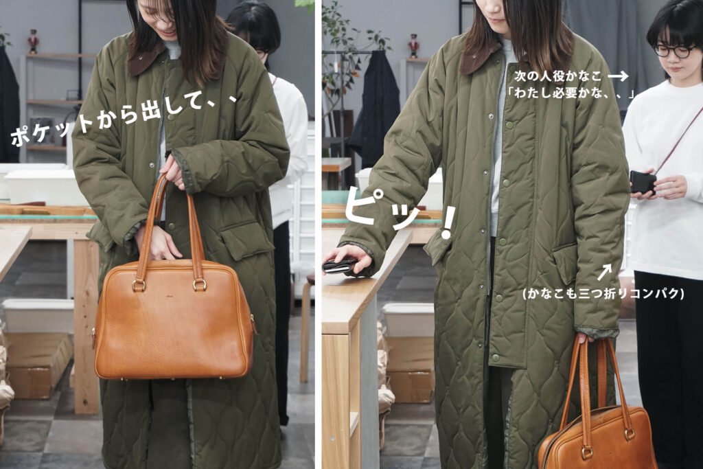 私は電車通勤で、朝は学生さんの集団の流れに流されながらスムーズに改札を出ないといけないので、浅ポケットに交通系ICカードの入れた『三つ折りコンパクトウォレット』をいれて、鞄の中を見ずとも出し入れできるようにしています。