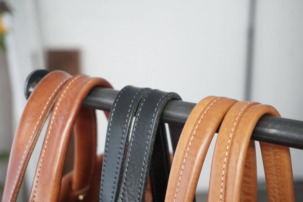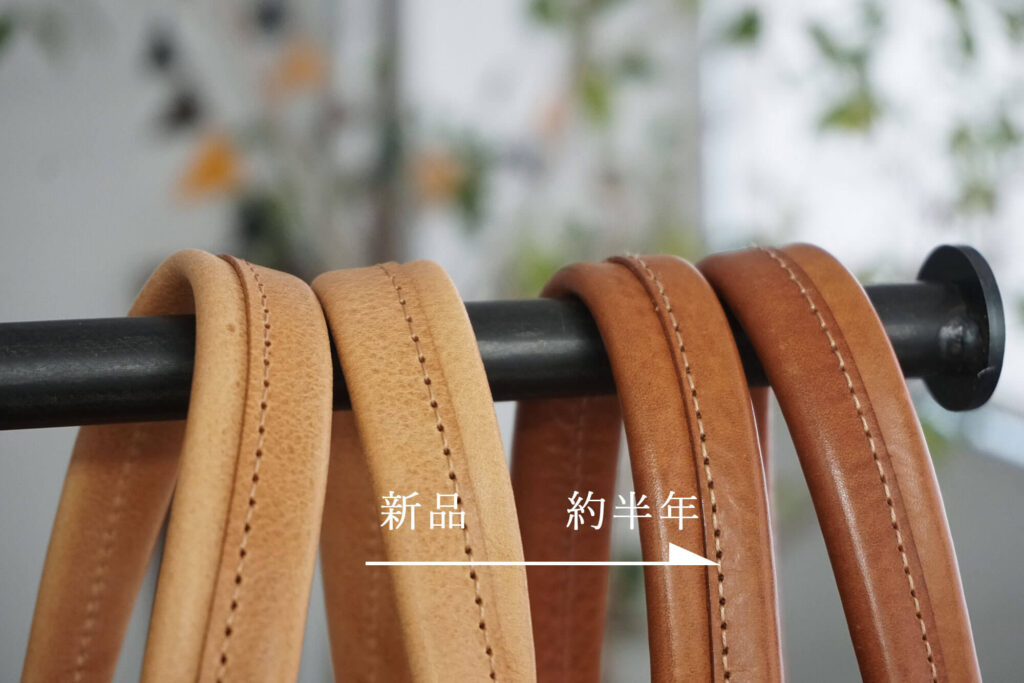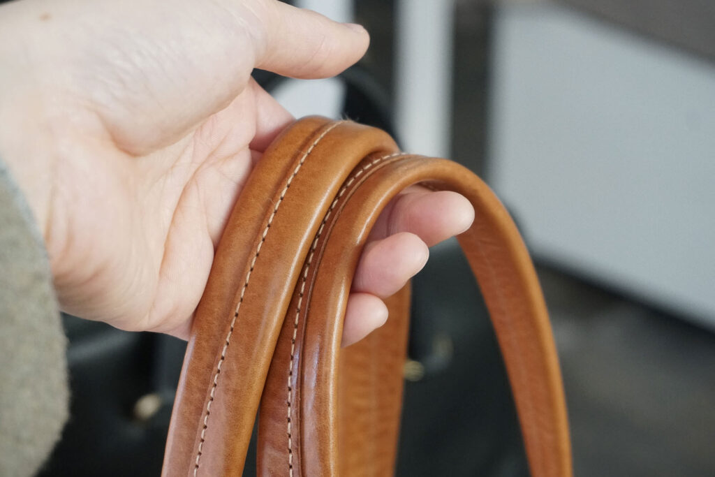まだ、使い初めの頃は皮が柔らかくなりきっていないので、ハンドルにも張りがありましたが、今ではだいぶ私の手に馴染んできて、しっくりくるようになった気がします。(よく握る部分の艶がすごい)