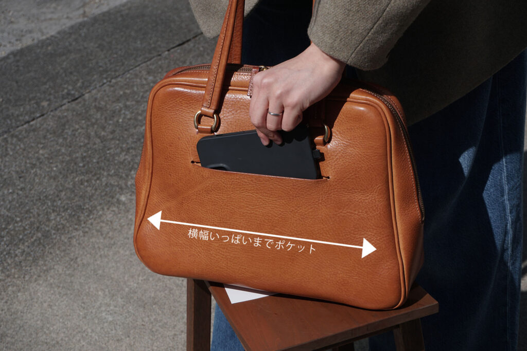 頻繁に出し入れするスマホはファスナーの中だと面倒なので、外ポケットはとても嬉しいポイント。
