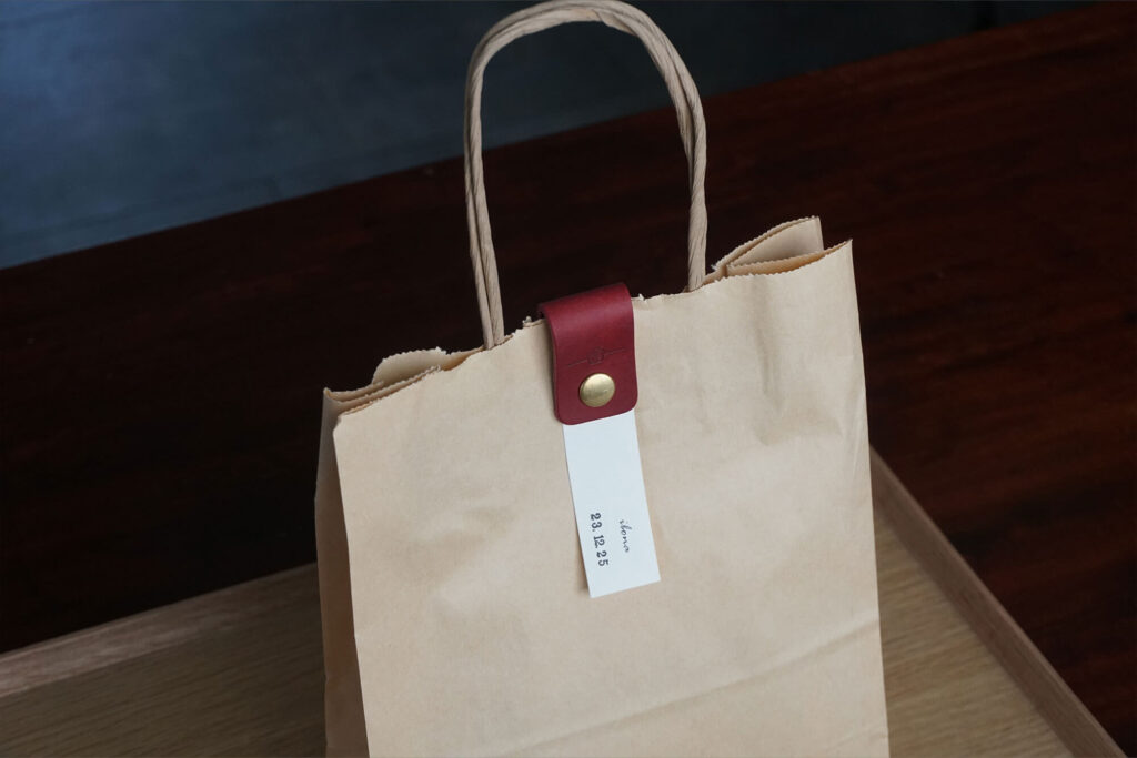 店頭でお持ち帰りいただく際にはこのようなクリップを紙袋にお付けしております。