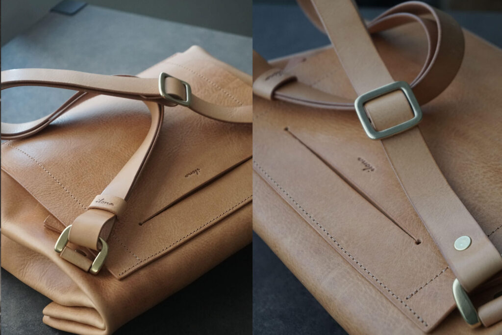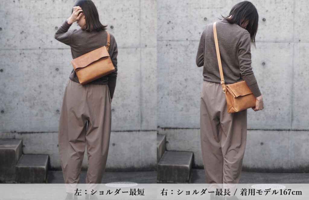 今回の仕様変更に伴い、ショルダーが鞄本体と固定される事となるので、「ショルダーを外してクラッチバッグのように手で持つ」というスタイルでお持ちいただく際はショルダーが邪魔になってしまうかもしれません。