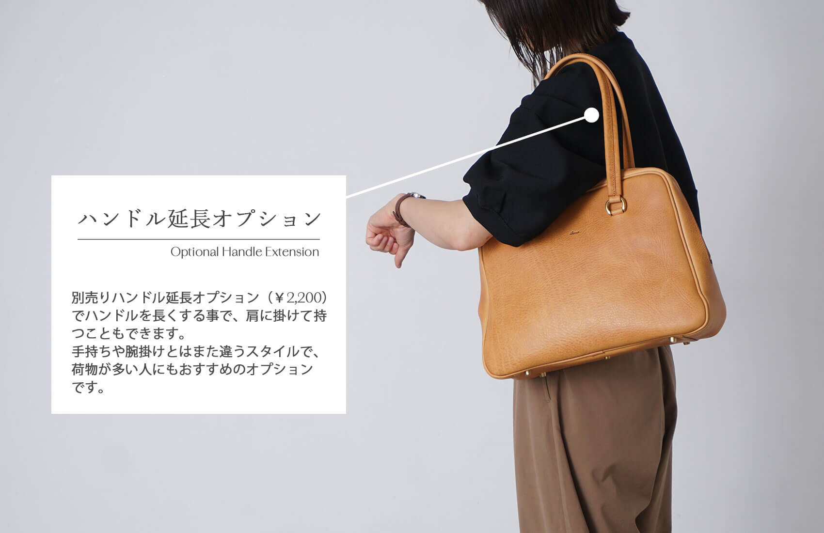 通常仕様のハンドルは「手持ち」や「腕に通す」持ち方を想定していますが、オプション(+2,200円)にてハンドルを延長し、肩掛けスタイルでもお使いいただけます。