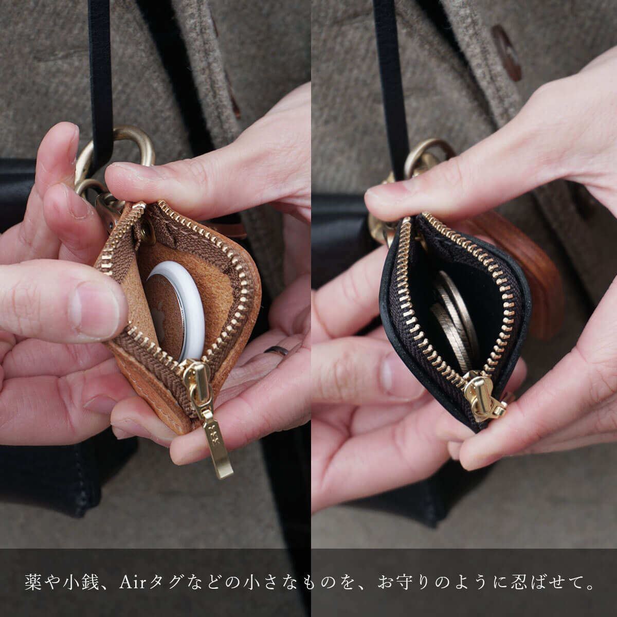 500円玉を数枚入れたり、常備薬やAirTagを忍ばせたりして、いざという時には頼りになる、持っていると少し気分が上がる、小さなお守りのようなチャームです。