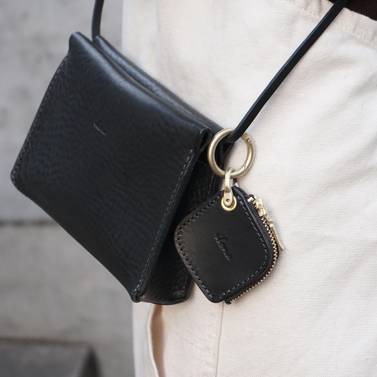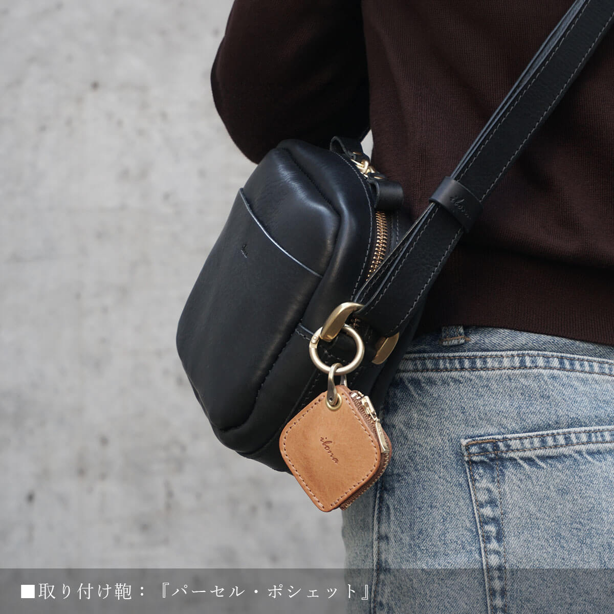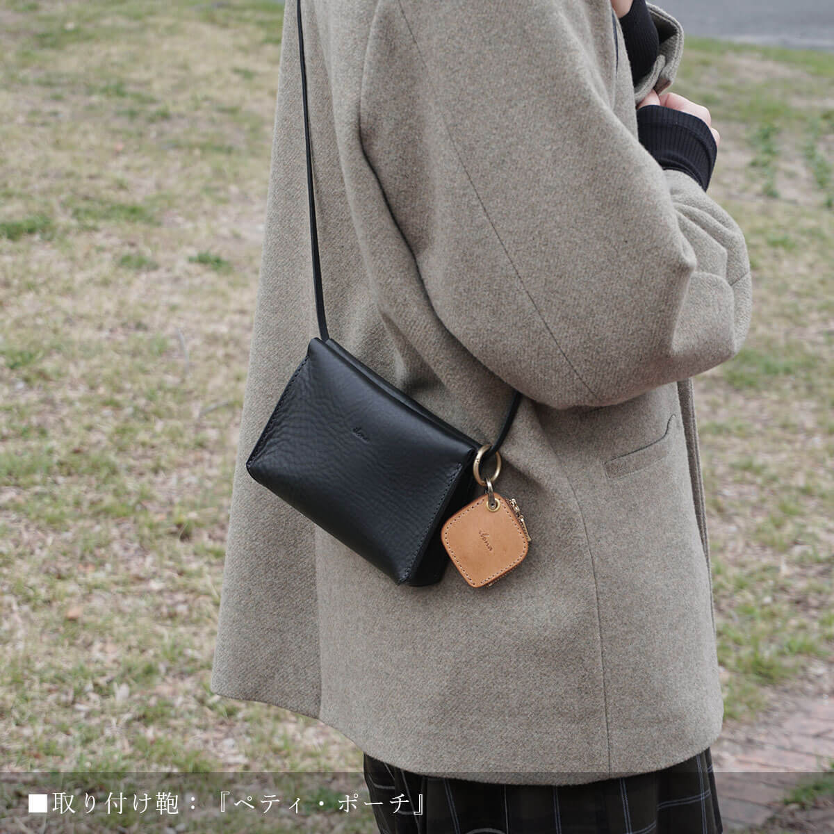 『ペティ・ポーチ(マキシマム)』に合わせて作った小さなサイズ感と、四角でも丸でもない絶妙な形がシンプルな鞄にさり気ないアクセントを添えてくれます。